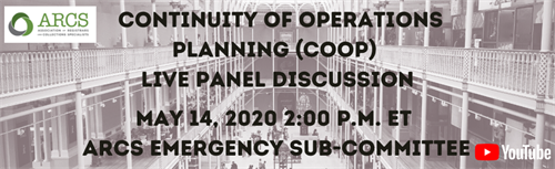 The ARCS Emergency Sub-Committee and industry experts to discussed how collections managers and registrars should and can play an integral part in creating a COOP for their institutions. Areas of discussion included how to be an advocate for your collections and their care during a long-term closure, how to effectively communicate with essential staff as they assist with collections duties such as environmental monitoring and pest management, and how to talk to lenders and insurers about the care of the collection while not onsite.